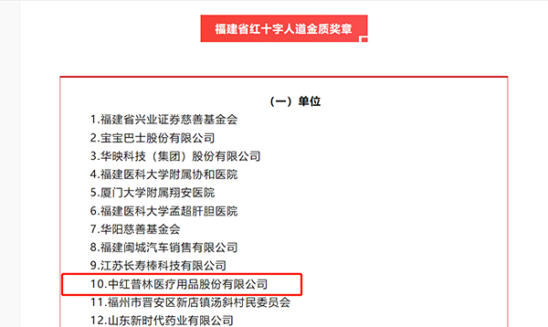 中紅普林醫(yī)療用品股份有限公司(以下簡稱:中紅醫(yī)療)被授予福建省紅十字會人道金質(zhì)獎?wù)拢员碚弥屑t醫(yī)療在支持人道救助事業(yè)方面做出的貢獻。