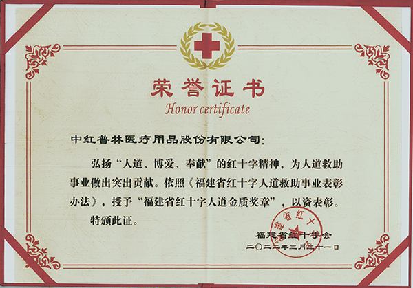 中紅普林醫(yī)療用品股份有限公司(以下簡稱:中紅醫(yī)療)被授予福建省紅十字會人道金質獎章,以表彰中紅醫(yī)療在支持人道救助事業(yè)方面做出的貢獻。