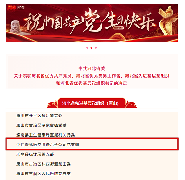 在慶祝中國共產(chǎn)黨成立100周年的重大時刻,在“兩個一百年”歷史交匯的關(guān)鍵節(jié)點,為了表彰先進(jìn)、弘揚正氣,激勵全省各級黨組織和廣大黨員干部奮發(fā)作為、建功立業(yè),中共河北省委印發(fā)《關(guān)于表彰河北省優(yōu)秀共產(chǎn)黨員、河北省優(yōu)秀黨務(wù)工作者、河北省先進(jìn)基層黨組織和河北省優(yōu)秀基層黨組織書記的決定》。中紅普林醫(yī)療股份六分公司黨支部榮獲“河北省先進(jìn)基層黨組織榮譽(yù)”稱號。